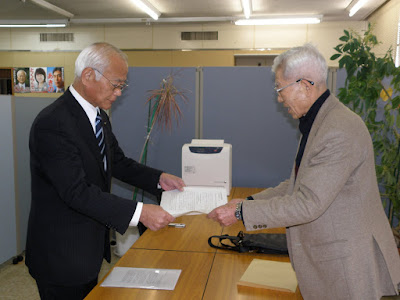 「それいけ! ずっこけ三人組」などの著者として知られる人気児童文学作家・那須正幹氏が1月22日、民主党山口を訪れ、次期参議院議員選挙において野党共闘での統一候補擁立を呼び掛ける要請書を西嶋代表に手渡しました。